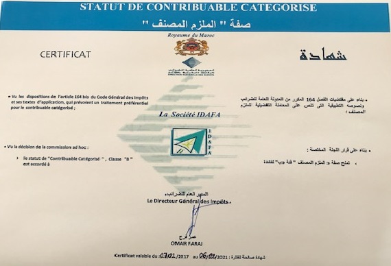 IDAFA a obtenu le statut de « contribuable cétagorisé » attribué par la Direction Générale des Impôts du Maroc en récompense de la transparence de ses comptes et la rigueur de sa gouvernance. Il a été ainsi la première société PME de son secteur au Maroc à accéder à ce statut.