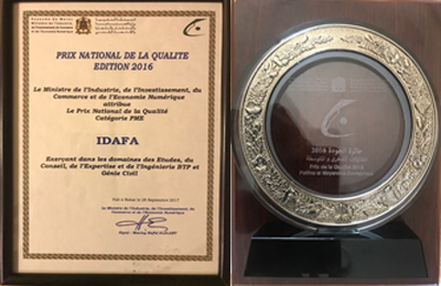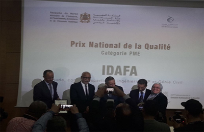 Dans le cadre de la Semaine Qualité, le Ministre de l’Industrie, de l’Investissement, du commerce et de l’Économie Numérique accompagné du Ministre de l’Emploi et des affaires sociales a remis à Casablanca le trophée du Prix National de la Qualité Édition 2016 catégorie PME à IDAFA.